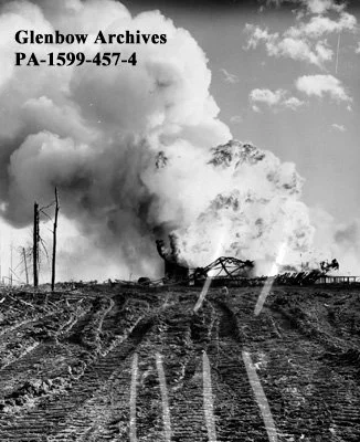 "Fire at Texaco's Pigeon Lake 16-26 oil well, Pigeon Lake, Alberta.", [ca. 1954-10-27], (CU1203871) by Befus, Harry; Calgary Herald. Courtesy of Libraries and Cultural Resources Digital Collections, University of Calgary.